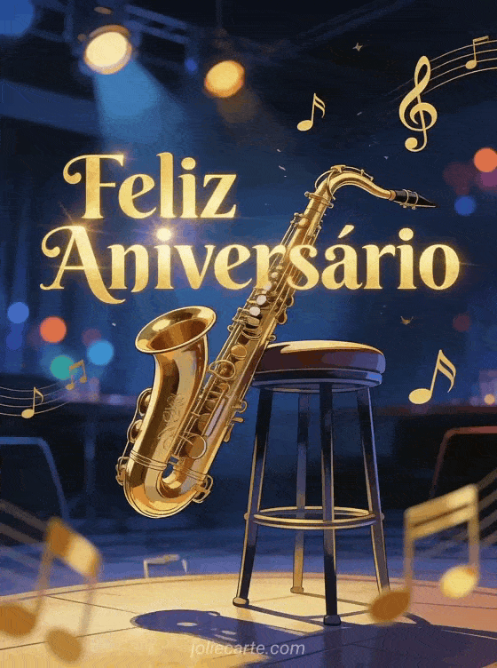Celebre um aniversário com este elegante cartão que mostra um saxofone dourado sobre um banquinho em um clube de jazz, iluminação azul suave, holofotes quentes, notas musicais douradas flutuando no ar e bokeh colorido. Descubra também um cartão de aniversário romântico ou um cartão de aniversário animado musical.