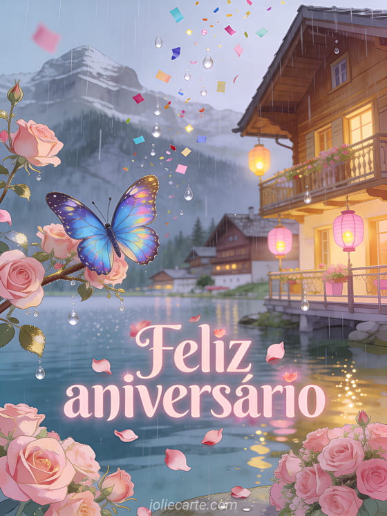 Celebre um aniversário com este terno cartão que mostra uma borboleta morpho azul pousada em um galho florido junto a um lago alpino suíço com chalés de madeira sob chuva suave, rosas cor-de-rosa, confetes coloridos e lanternas rosadas. Descubra também um cartão de aniversário de conto de fadas ou um cartão de aniversário na areia.