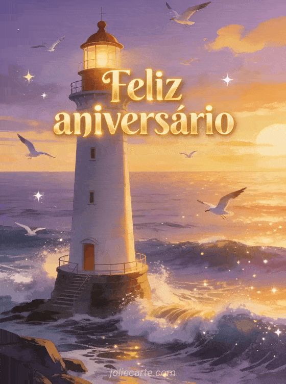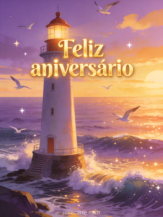 Celebre um aniversário com este cartão deslumbrante que mostra um magnífico farol à beira do oceano ao pôr do sol, com ondas cintilantes, céus púrpura e dourados, e aves marinhas em voo. Descubra também um cartão de aniversário com borboleta ou um cartão de aniversário animado.