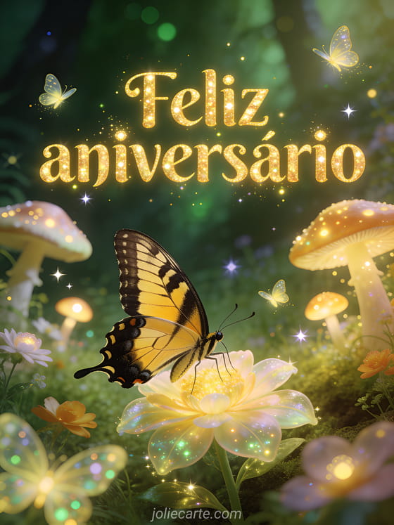 Celebre um aniversário com este encantador cartão que mostra uma magnífica borboleta rabo-de-andorinha pousada em uma flor féerica em uma clareira mágica com cogumelos luminosos, vagalumes e estrelas cintilantes. Descubra também um cartão de aniversário na areia ou um cartão de aniversário surpresa.