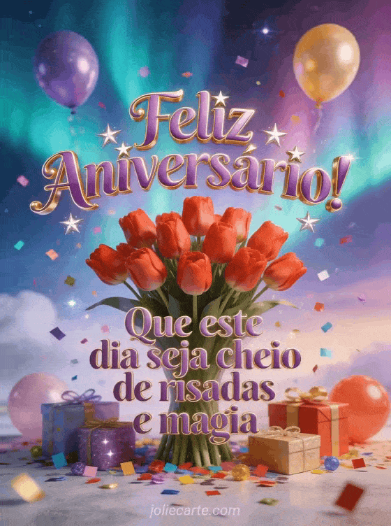 Celebre um aniversário cheio de magia com este encantador cartão de fantasia com vibrantes tulipas vermelhas cercadas de confete colorido, presentes, balões e coloridas auroras boreais dançando no céu. Descubra também um cartão de aniversário para crianças ou um cartão de aniversário para menina.