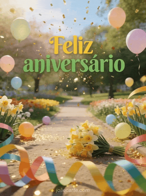 Celebre um aniversário com este alegre cartão primaveril com um parque de narcisos em flor, balões pastel flutuando no ar e brilhos dourados caindo do céu. Descubra também um cartão de aniversário para crianças ou um cartão de aniversário mágico.
