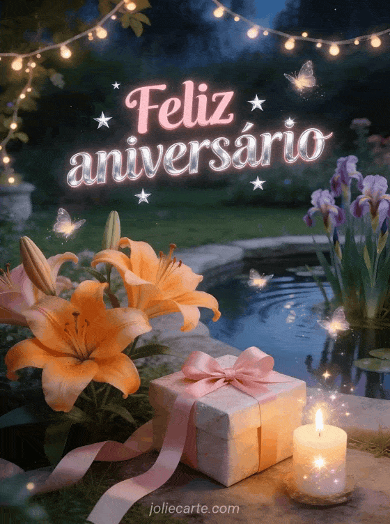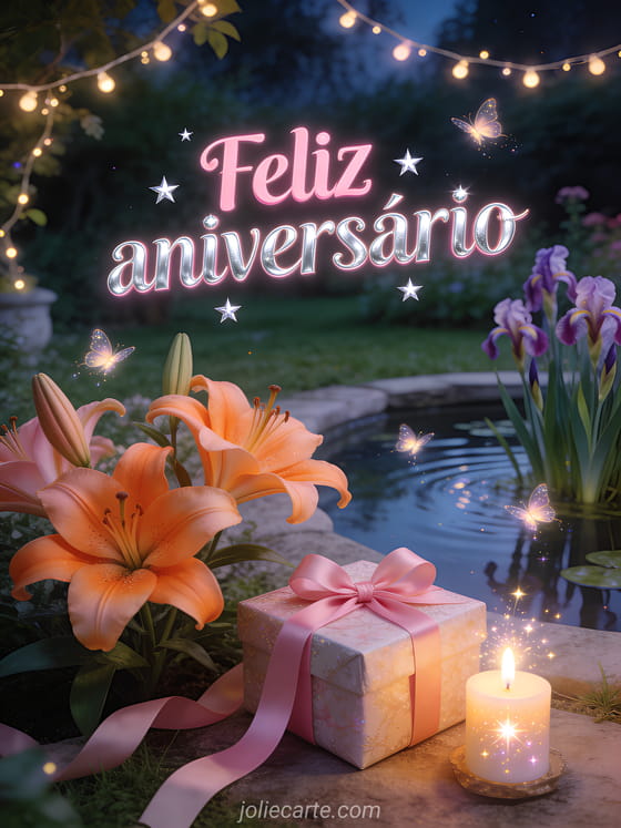 Celebre um aniversário com este encantador cartão de conto de fadas com suntuosos lírios laranjas perto de um lago de jardim com íris aquáticas, vagalumes cintilantes e luzinhas brilhantes em uma noite mágica. Descubra também um cartão de aniversário para crianças ou um cartão animado de aniversário.