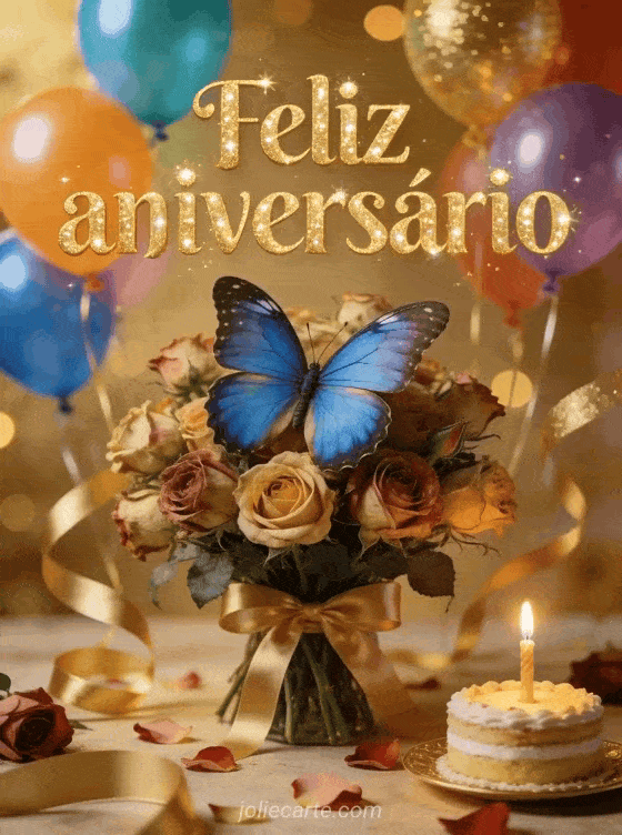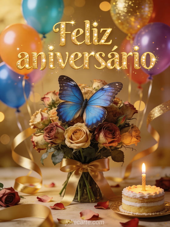 Ilumine o aniversário de alguém especial com este cartão encantador com uma adorável borboleta morpho azul pousada sobre um buquê de rosas antigas cercada de balões coloridos. Descubra também uma mensagem de aniversário para amigo ou um cartão de aniversário para amiga.
