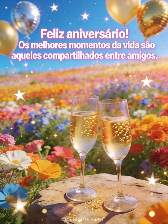 Envie este vibrante cartão de aniversário de amizade com uma superfloração de flores silvestres, taças de champanhe sobre uma rocha plana, balões dourados e prateados flutuando, e estrelas festivas cintilantes. Descubra também um cartão de aniversário para amigo ou um cartão de aniversário com balão de ar quente.