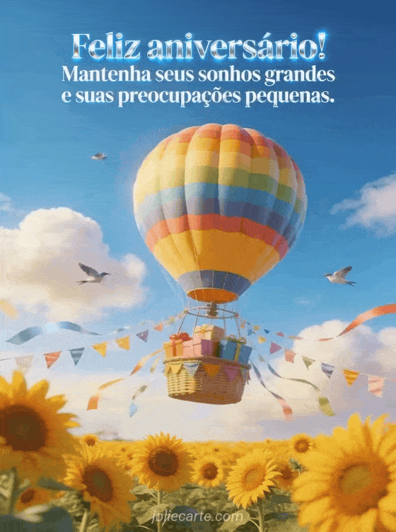 Envie este alegre cartão de aniversário de amizade com um colorido balão de ar quente voando sobre campos dourados de girassóis sob um céu azul com pássaros em voo e presentes na cesta. Descubra também um mensagem de aniversário para um amigo ou um cartão de feliz aniversário para amiga.