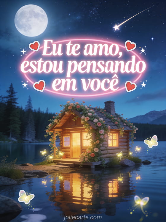 Expresse seu amor com este lindo cartão que mostra uma encantadora cabana à beira de um lago cercada de corações. Uma mensagem terna para dizer a alguém especial que está pensando nessa pessoa. Descubra também um cartão de amor pensando em você ou um cartão eu te amo pensando em você.