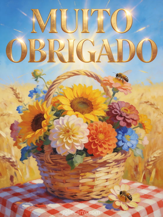 Expresse sua profunda gratidão com este alegre cartão que mostra girassóis e dálias em um luminoso cenário de verão. Uma calorosa e alegre ilustração para dizer muito obrigado. Descubra também um cartão obrigado pela sua resposta ou um cartão obrigado e bom dia.
