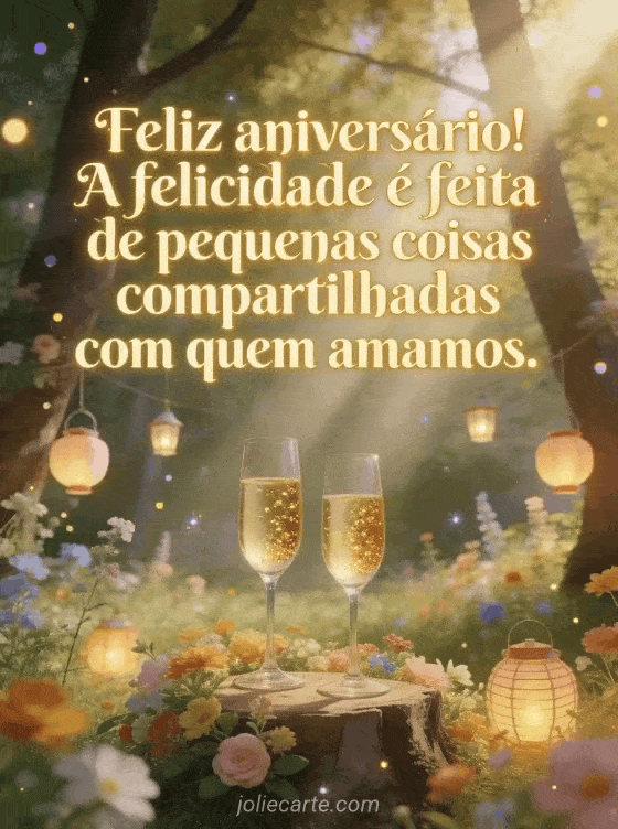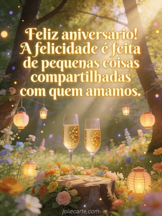 Envie este encantador cartão de aniversário para sua filha com taças de champanhe sobre um toco florido em uma clareira ensolarada com lanternas festivas e flores silvestres. Descubra também um cartão de feliz aniversário para filha ou um cartão de aniversário de unicórnio para filha.