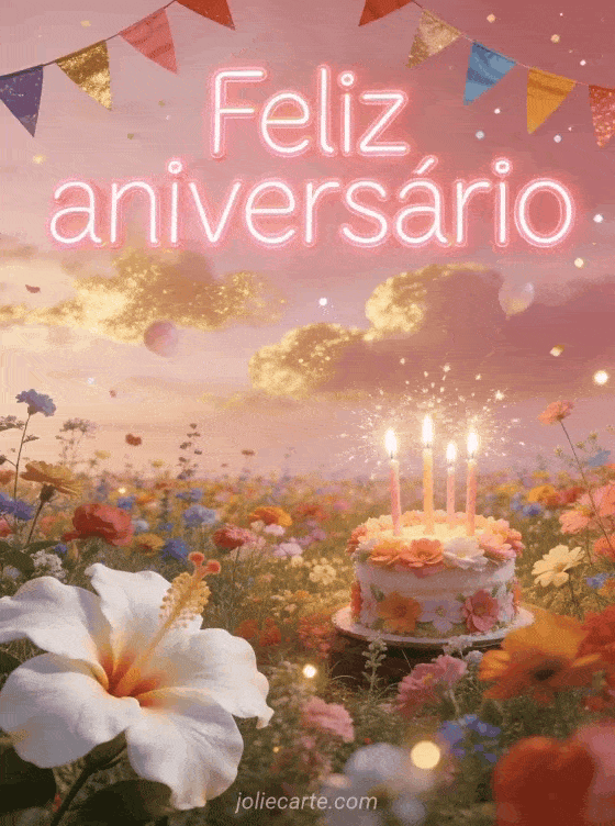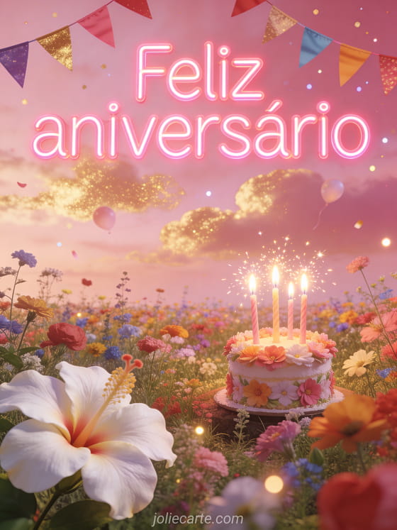 Envie este encantador cartão de aniversário com um romântico campo de flores silvestres, letras rosa neon brilhantes, bandeirinhas coloridas e um pequeno bolo florido sob um céu rosado. Descubra também um cartão de aniversário de unicórnio para filha ou um cartão de feliz aniversário para filha.