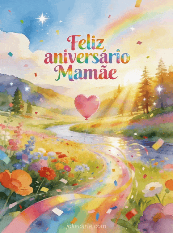 Celebre o aniversário da sua mãe com este lindo cartão gratuito com um vale florido com rio, um balão rosa em forma de coração flutuando, confete colorido e luz dourada. Uma saudação vibrante em aquarela. Descubra também uma imagem de aniversário para mamãe ou um cartão animado de aniversário para mamãe.