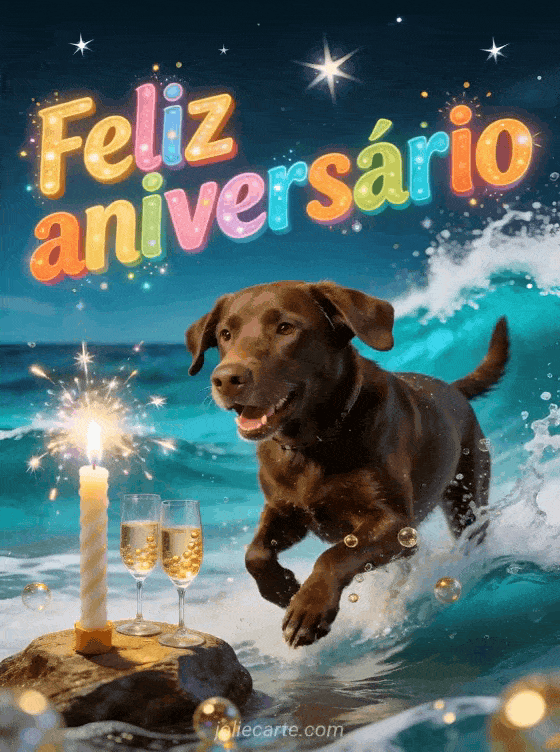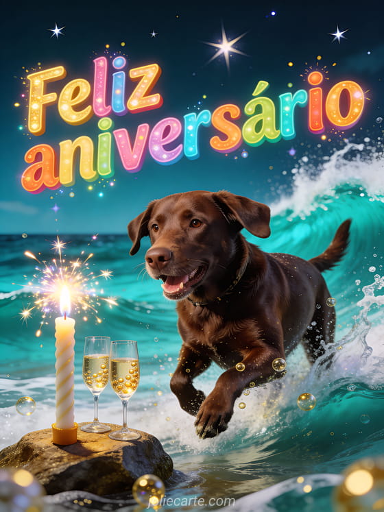 Celebre com este dinâmico cartão de aniversário com um alegre labrador chocolate brincando nas ondas turquesa com uma vela sparkler brilhante, taças de champanhe com bolhas douradas sobre uma rocha e estrelas brilhantes no céu. Descubra também uma imagem de aniversário para adolescente ou um gif de aniversário para adolescente.