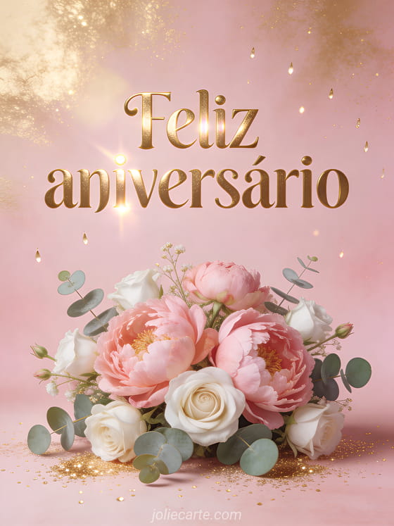 Celebre o aniversário de uma irmã com este elegante cartão que mostra um suntuoso arranjo de peônias rosas, rosas brancas e eucalipto com glitter dourado caindo suavemente sobre um delicado fundo rosa pastel. Descubra também um cartão de aniversário para uma irmã ou um gif de feliz aniversário irmã mais velha.