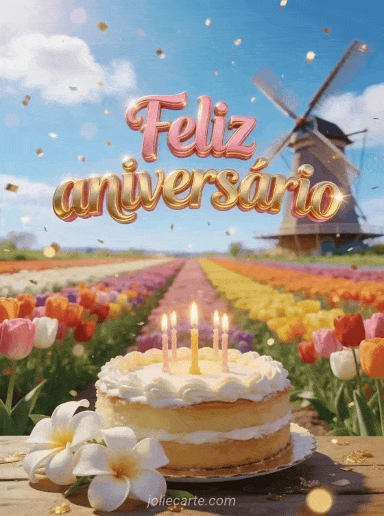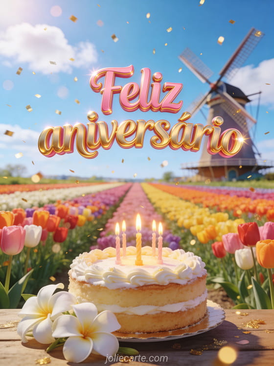 Celebre um aniversário especial com este colorido cartão que mostra campos interminaveis de tulipas, flores de tiaré, um bolo decorado com velas acesas e uma chuva de glitter dourado. Descubra também um cartão de feliz aniversário ou uma imagem grátis de feliz aniversário.