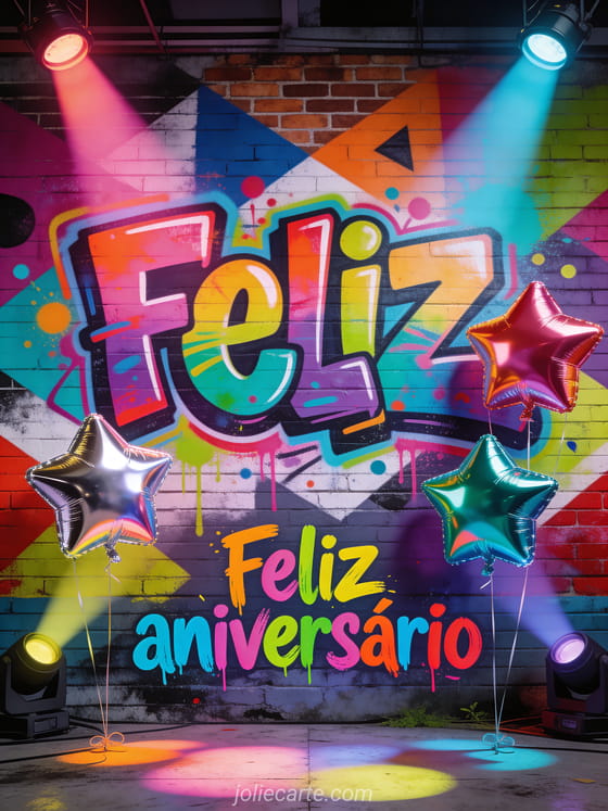 Surpreenda com este cartão de aniversário estilo graffiti sobre um muro de tijolos com arte urbana vibrante, balões metálicos em forma de estrela e projetores coloridos. Descubra também um cartão de aniversário para adolescentes ou um cartão de aniversário para jovem.