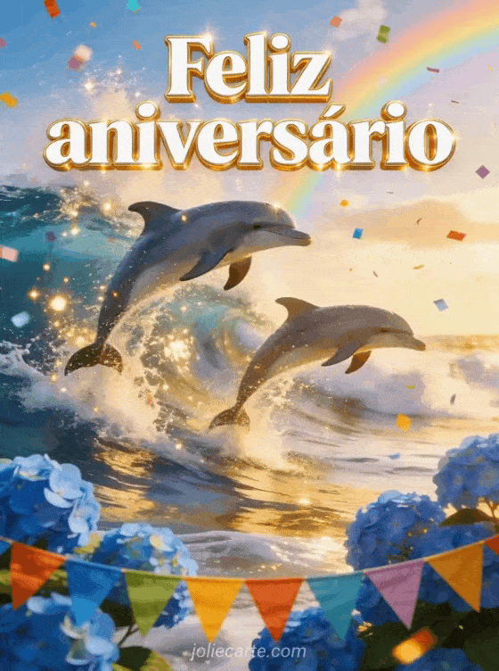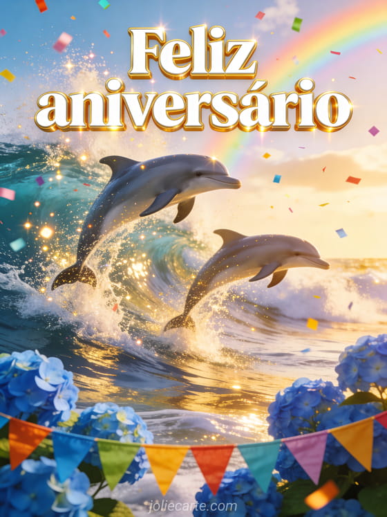 Celebre um aniversário com este alegre cartão animado com golfinhos saltando sobre ondas brilhantes, hortênsias azuis, confete colorido, uma bandeirola festiva e um suave arco-íris em um céu dourado. Descubra também um cartão animado de aniversário com cachorro ou um cartão virtual animado de aniversário.