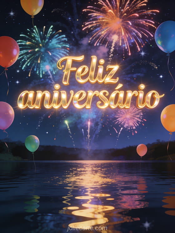 Celebre um aniversário com este grandioso cartão com espetaculares fogos de artifício multicoloridos explodindo em um céu noturno estrelado sobre um lago, reflexos de luz na água e balões coloridos flutuando para o céu. Descubra também um cartão de feliz aniversário irmãzinha ou um desenho de aniversário para irmã.
