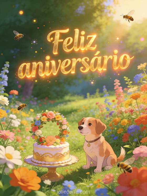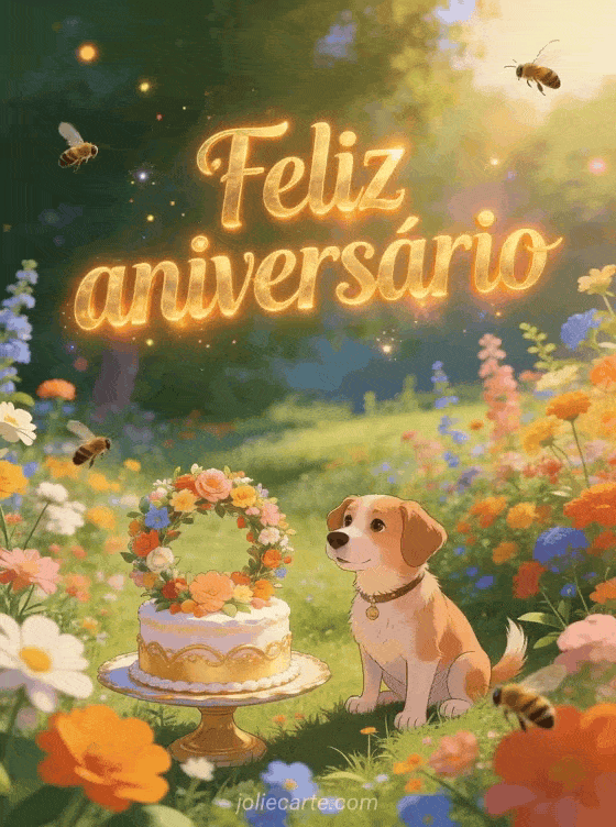 Alegre o dia especial de alguém com este lindo cartão animado de aniversário com um adorável cachorro sentado em um exuberante jardim de verão florido, uma coroa de flores festiva, um elegante bolo de aniversário e sol radiante com partículas luminosas. Descubra também um cartão virtual animado de aniversário ou um cartão animado de aniversário.