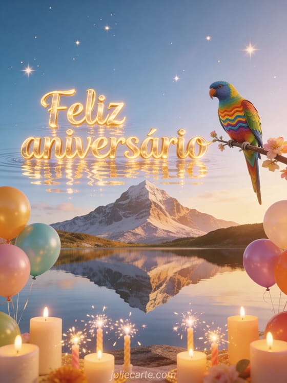 Celebre um dia especial com este lindo cartão animado de aniversário com um lago espelho que reflete montanhas perfeitamente, um periquito colorido em um galho florido e velas de aniversário brilhantes com balões coloridos. Descubra também um cartão animado de aniversário ou um cartão musical animado de aniversário.