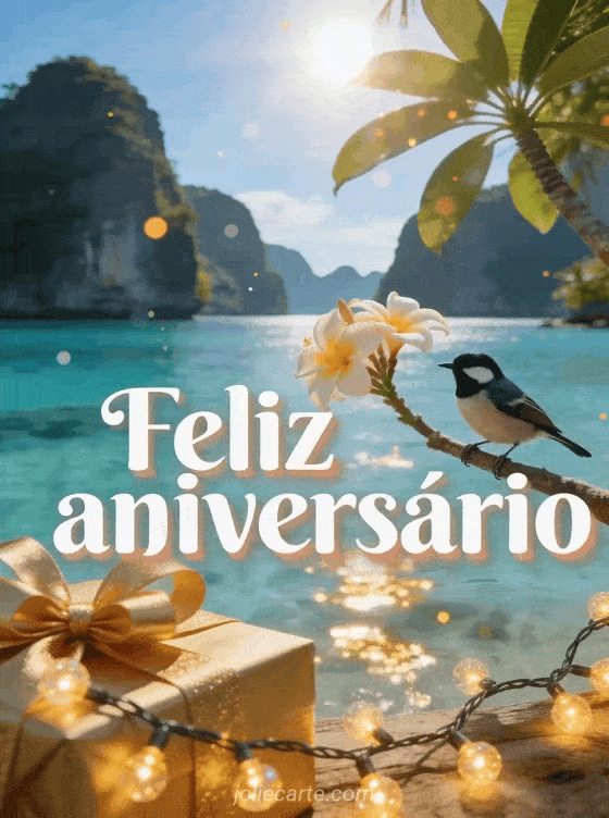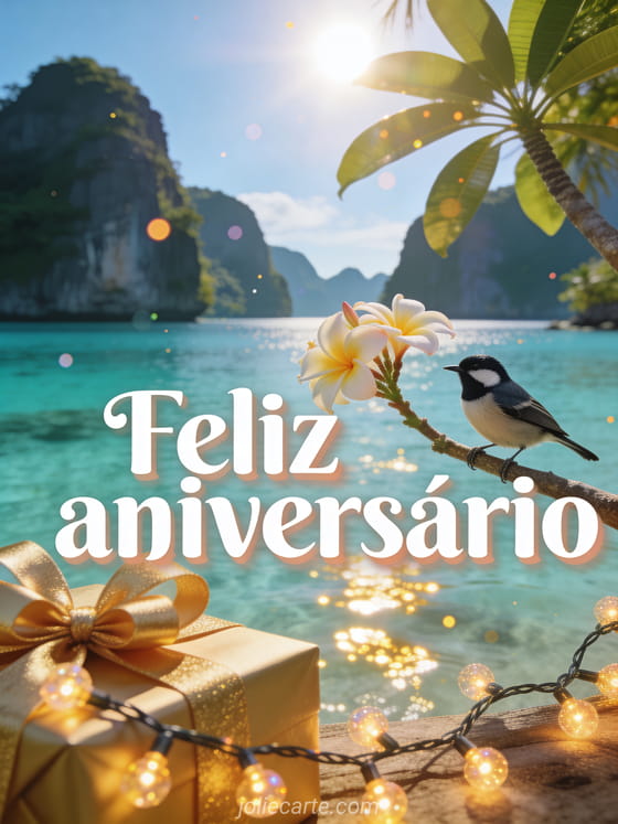 Alegre o dia especial de alguém com este lindo cartão animado de aniversário com uma lagoa tropical turquesa, um chapim-real pousado em flores de frangipani e reflexos dourados na água. Descubra também um cartão musical animado de aniversário ou um cartão animado de aniversário virtual.