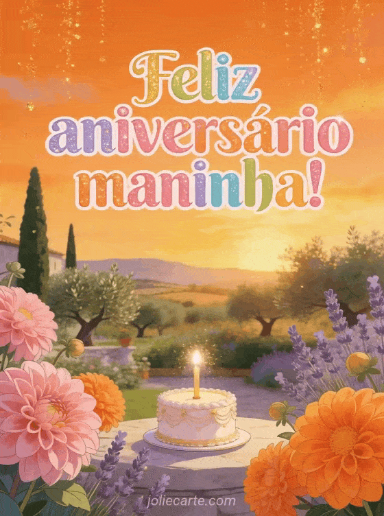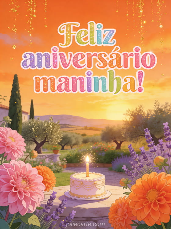 Celebre o aniversário da sua maninha com este lindo cartão com um jardim mediterrâneo banhado pela luz dourada do pôr do sol, dálias floridas e um bolo de aniversário cintilante. Descubra também um desenho de aniversário para irmã ou um cartão de aniversário para irmã.