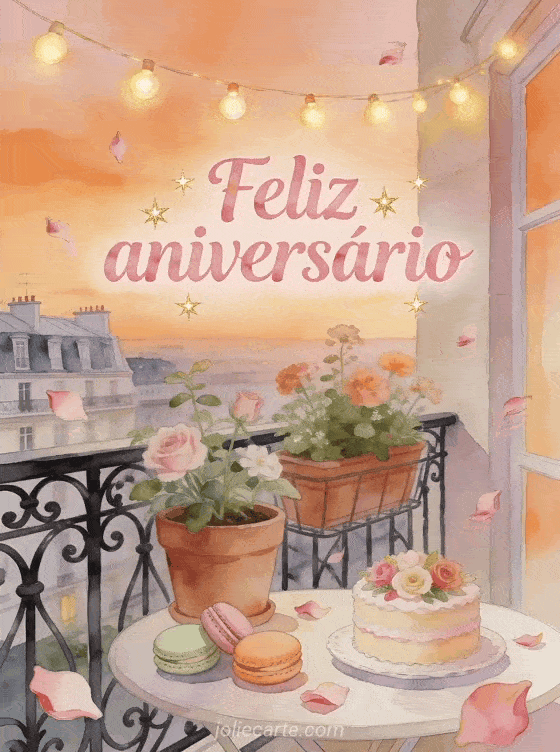 Celebre um aniversário especial com este encantador cartão que mostra uma varanda parisiense ao entardecer, macarons coloridos e um bolo decorado com flores. Descubra também um cartão de aniversário para adolescentes ou um cartão de aniversário para garotas.