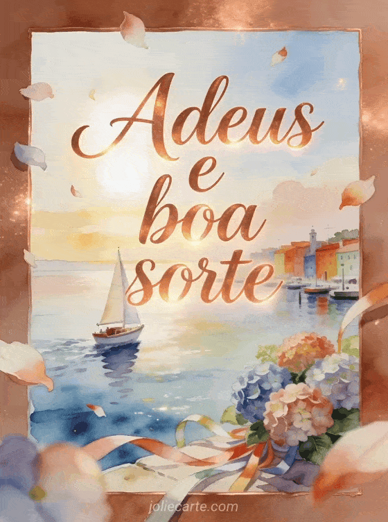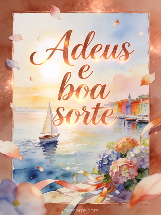 Envie adeus e boa sorte com escrita cobre acolhedora, um pequeno veleiro saindo de um porto colorido, hortênsias e fitas. Veja também texto para desejar boa sorte, boa sorte na sua prova imagem ou cartão boa sorte para prova.