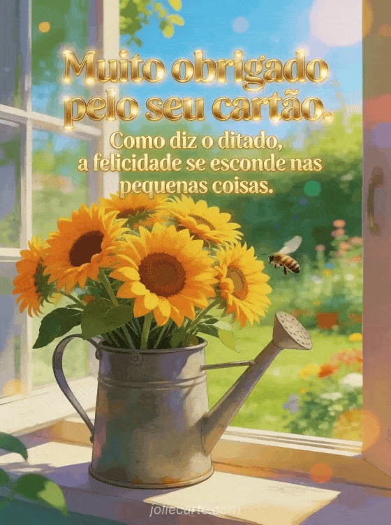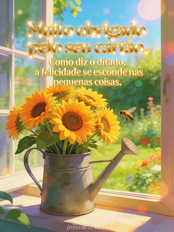 Expresse seu sincero agradecimento com este alegre cartao com um buquê de girassóis radiantes em um regador de zinco no parapeito de uma janela com vista para um jardim banhado de sol. Descubra também um seu cartão me tocou muito ou um cartao para responder a um cartao recebido.