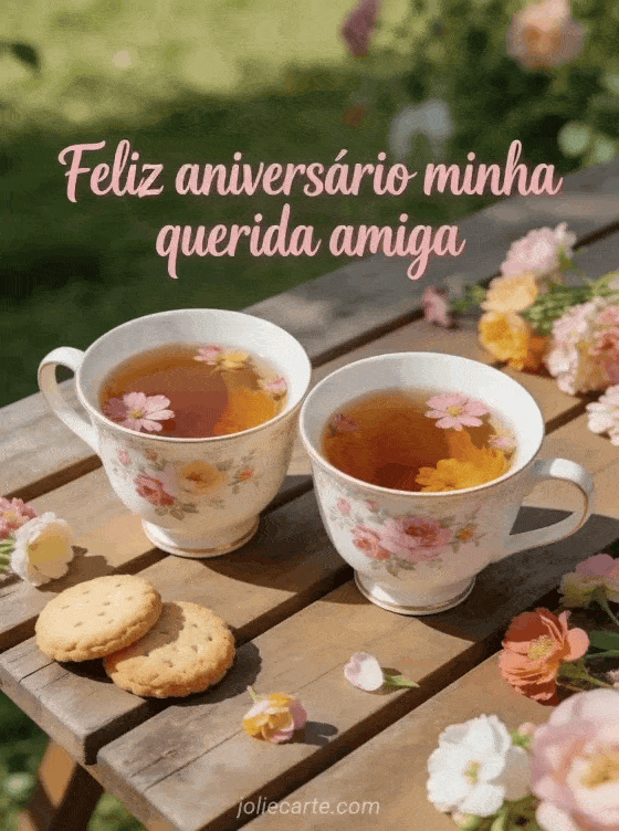Compartilhe este cartão de aniversário com xícaras de chá, flores e clima de amizade. Você também pode ver gif feliz aniversário mulher humor, aniversário mulher humor gif e cartão aniversário mulher praia.