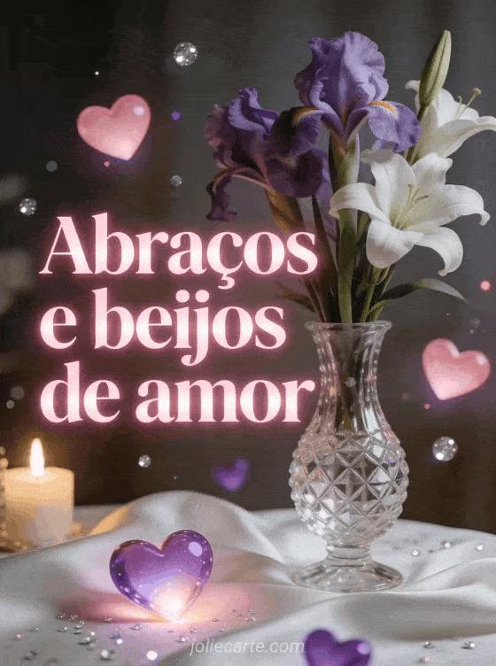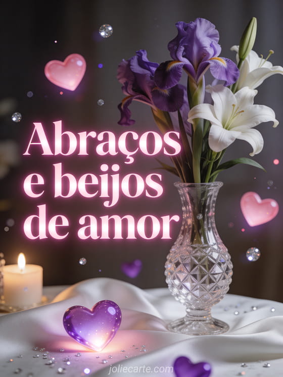 Envie este romântico cartão com as palavras Abraços e beijos de amor escritas em letras rosa com efeito de luz suave, com íris roxas e lirios brancos em um vaso de cristal sobre uma toalha de seda branca, com corações rosa e roxos luminosos flutuando com partículas prateadas. Descubra também uma imagem de beijos de amor ou um bom dia beijos namorados.