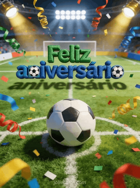 Celebre um menino com este dinâmico cartão de aniversário que mostra um campo de futebol visto de cima, uma bola no gramado, confetes e fortes luzes de estádio. Você também pode ver cartão aniversário animado 1 ano, cartões animados de aniversário jolie carte ou e-card aniversário animado.