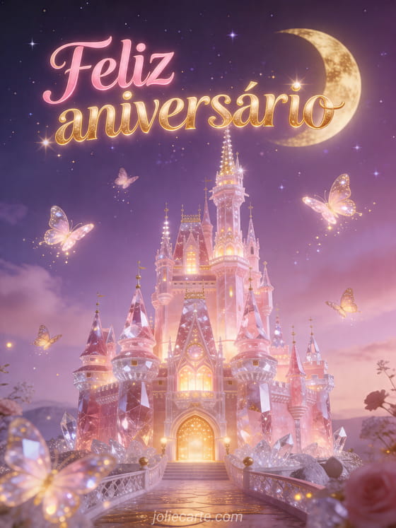 Compartilhe um feliz aniversário encantado com este cartão de conto de fadas com um castelo de cristal rosa iluminado, borboletas mágicas e uma lua dourada em um céu estrelado. Você também pode ver gifs animados grátis aniversário, cartão aniversário animado grátis musical homem ou animado feliz aniversário menino gif.