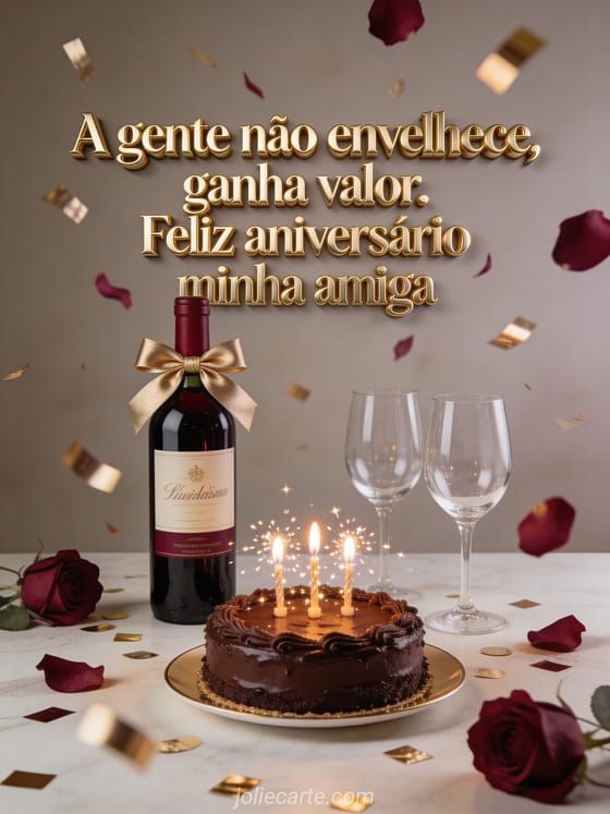 Compartilhe este cartão de aniversário com humor, vinho e brilho festivo. Veja também feliz aniversário amiga, aniversário amiga gif e mensagem aniversário amiga mulher.