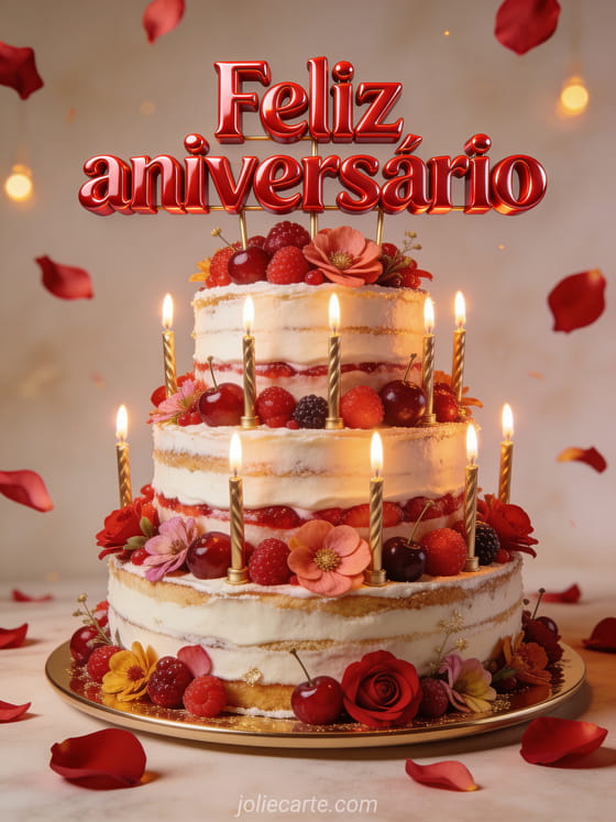 Comemore com um cartão de aniversário animado com bolo espetacular de cinco andares, frutas vermelhas e velas douradas. Veja também aniversário imagens animadas, cartão aniversário menino grátis animado e cartão virtual aniversário animado grátis.