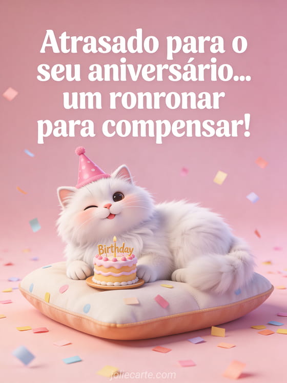Compense um aniversário atrasado com um doce cartão em estilo 3D com um gato persa branco e peludo usando chapéu de festa rosa, uma almofada macia, um bolo de aniversário em miniatura, confete pastel e fundo rosa-pó. Você também pode enviar um cartão de feliz aniversário atrasado para um homem, um cartão de feliz aniversário atrasado texto ou um gif grátis aniversário atrasado.
