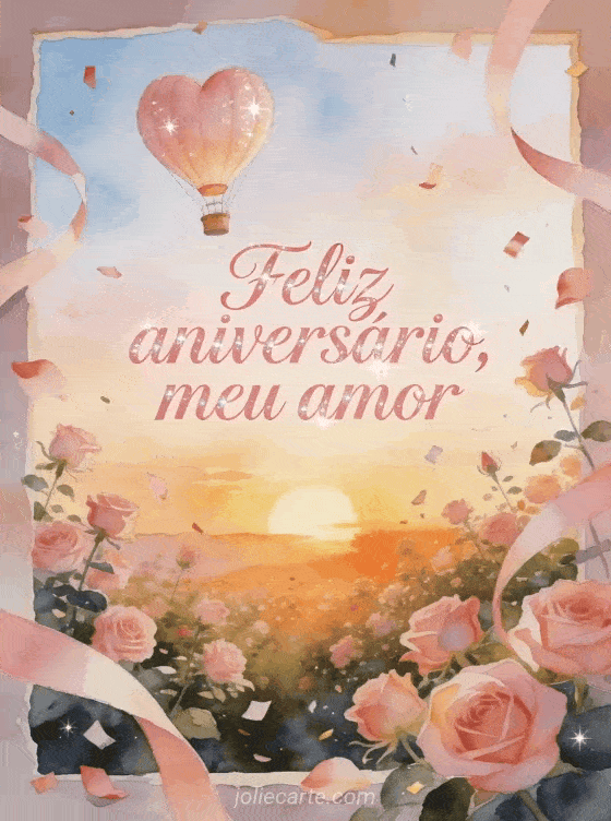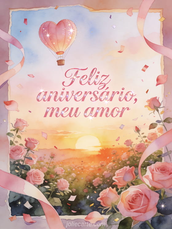 Compartilhe um momento romântico de aniversário com um cartão em aquarela que mostra um balão de ar quente em forma de coração sobre um jardim ao pôr do sol cheio de rosas, fitas flutuantes, pétalas e confetes. Personalize online e envie grátis. Veja também aniversário meu querido, um cartão feliz aniversário meu amor ou uma feliz aniversário minha querida imagem.