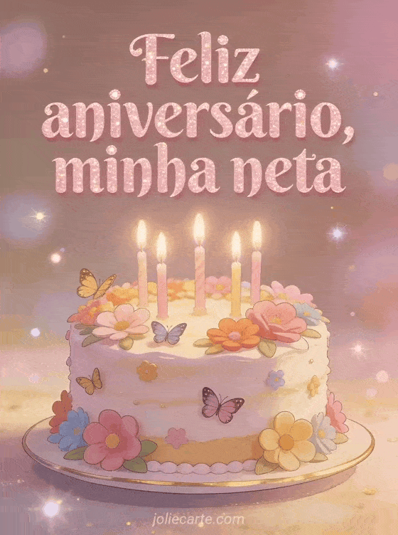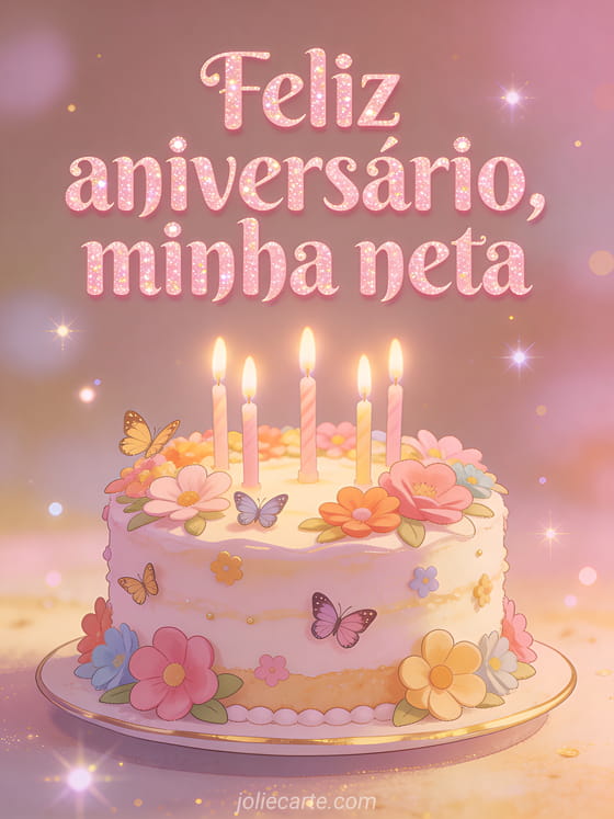 Envie uma mensagem terna de aniversário para sua neta com letras rosas suaves e brilhantes, e um bolo decorado com flores, borboletas e velas. Veja também cartão de aniversário para minha neta ou cartão aniversário neta.