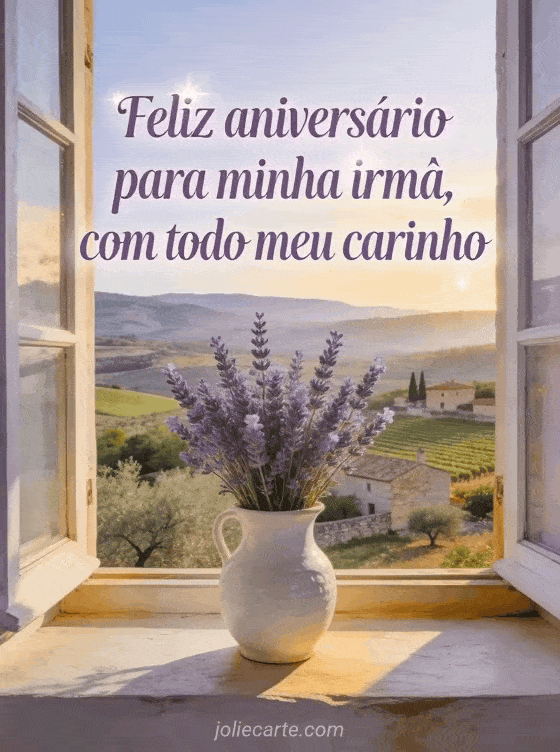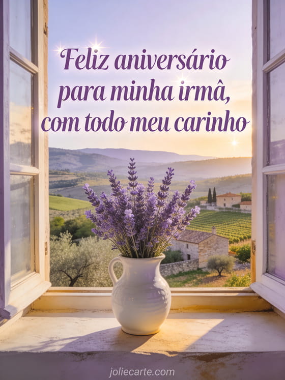 aniversário de uma irmã Uma mensagem de aniversário cheia de carinho para sua irmã, com lavanda e luz acolhedora.
