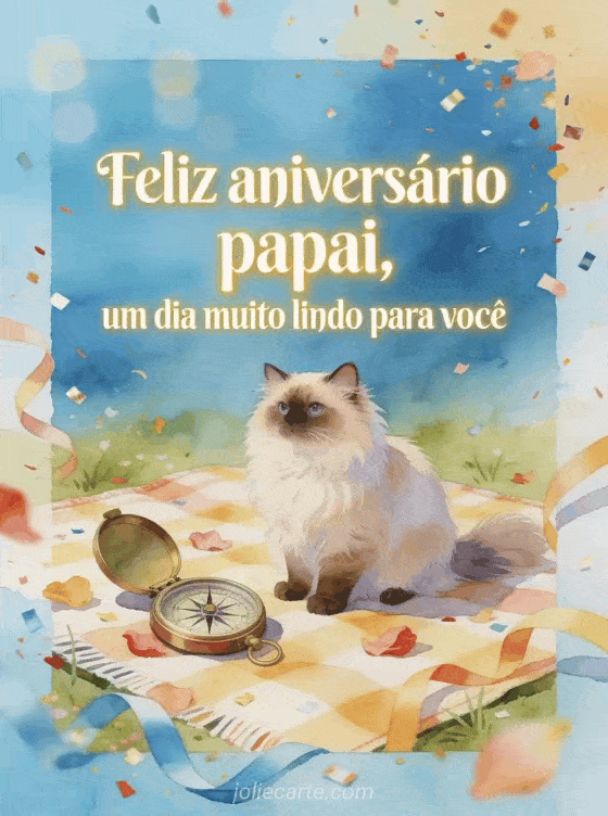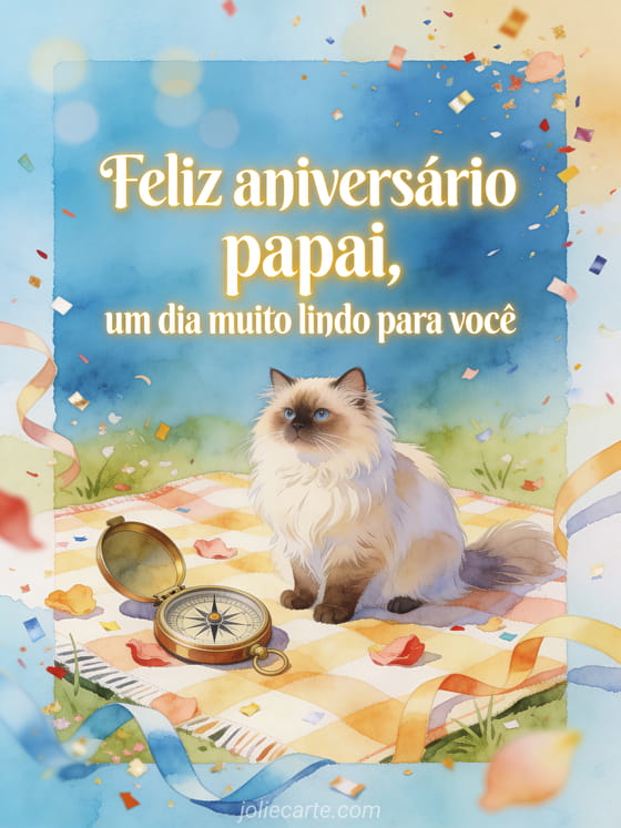 Envie uma mensagem de aniversário do papai com uma cena em aquarela de um gato angorá turco ao lado de uma bússola aberta sobre uma toalha de piquenique festiva. Você também pode compartilhar desenho aniversário papai, sua filha feliz aniversário papai da sua filha ou carta para o aniversário do papai.
