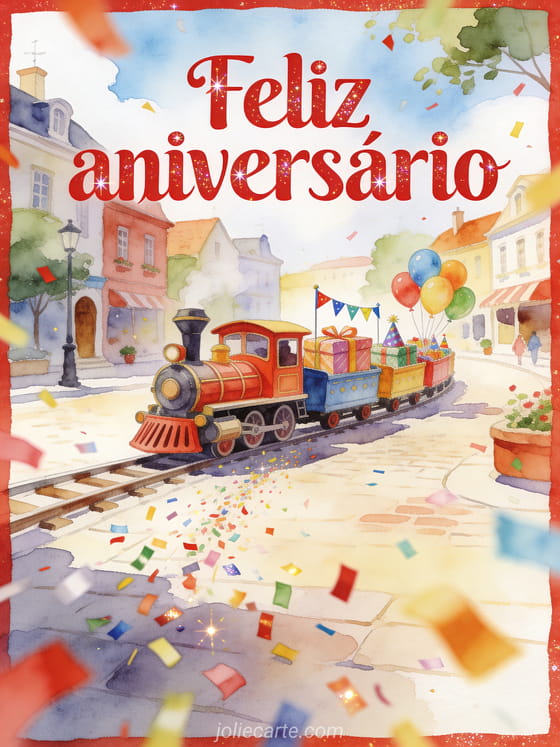Compartilhe um cartão de aniversário em estilo livro de histórias com um trem de brinquedo levando presentes embrulhados, balões e pequenas bandeirinhas por uma praça luminosa de vilarejo em aquarela, com confete no primeiro plano. Veja também um feliz aniversário meu filho gifs, um cartão de aniversário grátis para meu filho ou um feliz aniversário filho cartão.