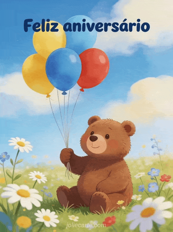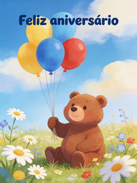 Compartilhe um cartão ilustrado e caloroso de aniversário com um urso marrom adorável segurando balões coloridos em uma campina florida sob um céu azul suave. Veja também um feliz aniversário meu filho, um feliz aniversário engraçado meu filho ou um texto de aniversário para meu filho.
