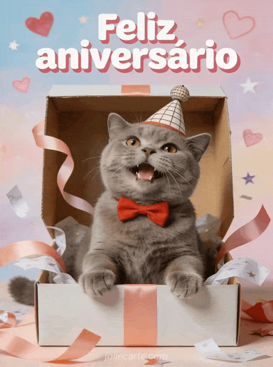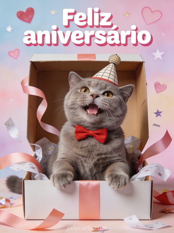 Surpreenda com um cartão de aniversário criativo: um gato british shorthair fotorrealista com chapéu e gravatinha dentro de uma caixa pequena. Você também pode ver vídeo aniversário hilariante, feliz aniversário gif animado humor e vídeo aniversário engraçado.