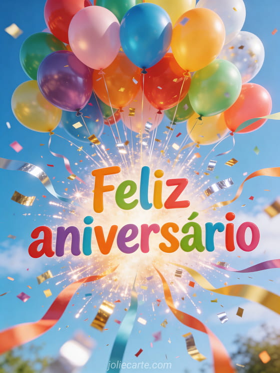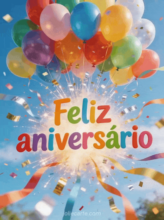 Envie este alegre gif animado de aniversário com balões coloridos e uma explosão de confete dourado e prateado num céu brilhante ao ar livre. Descubra também um cartão de aniversário animado grátis ou um feliz aniversário gif fogos de artifício animado.