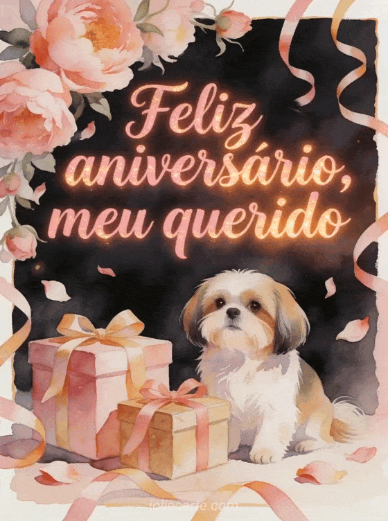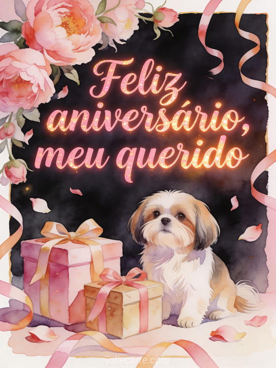 Celebre seu querido com um cartão de aniversário em aquarela que mostra um shih tzu encantador ao lado de presentes embrulhados com fitas sob peônias em cascata. Pétalas e serpentinas cruzam a borda com um brilho festivo e romântico. Veja também um cartão feliz aniversário meu amor, uma feliz aniversário minha querida imagem ou um gif animado feliz aniversário meu coração.