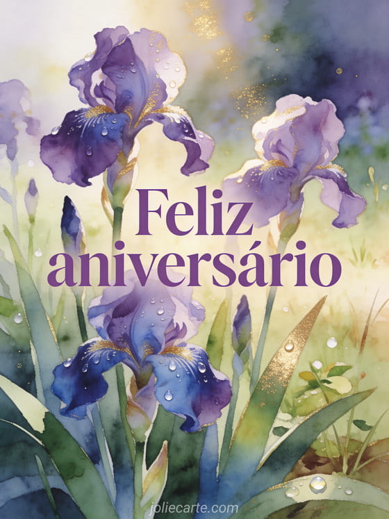 Compartilhe um cartão de aniversário poético com íris violetas e azuis, luz dourada da manhã e visual em aquarela delicada. Você também pode ver aniversário mulher foto grátis, feliz aniversário mulher imagem e mensagem cartão aniversário mulher.