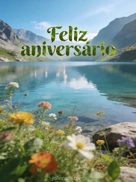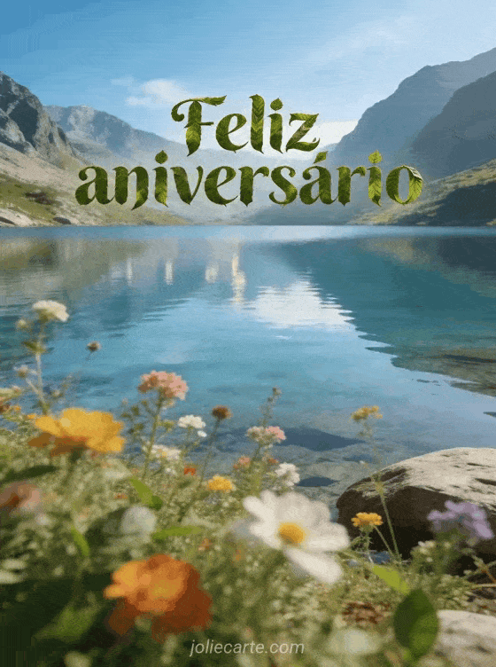 Compartilhe um tranquilo feliz aniversário com este cartão fotorrealista que mostra montanhas, um lago cristalino e flores silvestres sob um céu azul. Você também pode ver cartão aniversário mulher buquê de flores, gif grátis aniversário mulher humor ou foto aniversário mulher.