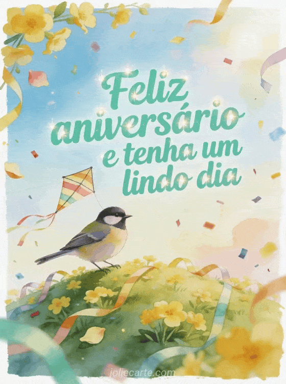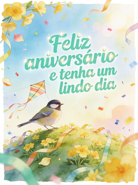 Compartilhe um cartão carinhoso de aniversário para sua neta com um passarinho delicado, uma pipa listrada, prímulas e fitas festivas em uma cena ensolarada de aquarela. Veja também uma feliz aniversário neta imagem para celebrar esse dia com ternura.