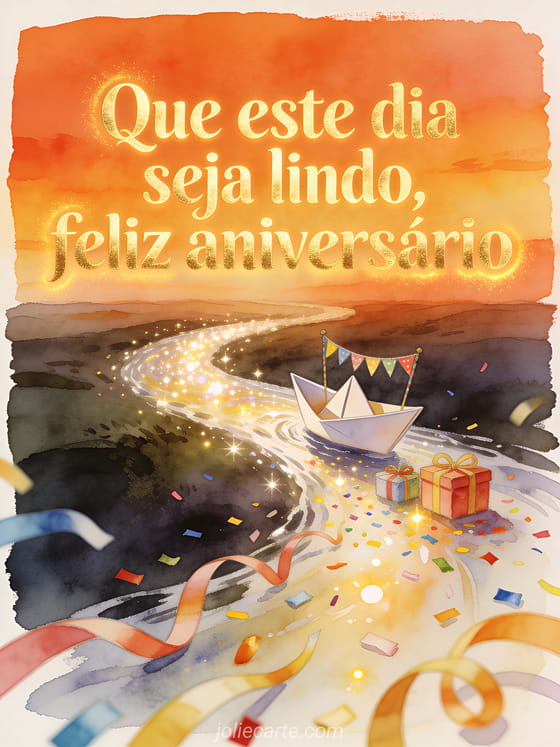 Envie uma mensagem de aniversário carinhosa para seu filho com um barco de papel em aquarela deslizando por um riacho brilhante. Bandeirinhas, pequenos presentes e confetes deixam a cena alegre e leve. Veja também um feliz aniversário meu grandão.