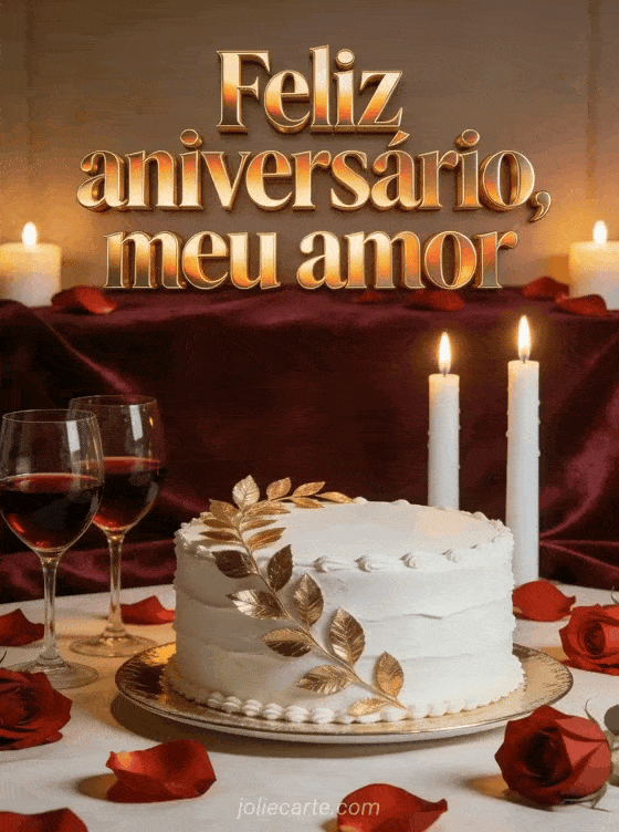 Envie uma mensagem de aniversário romântica com uma cena fotorrealista de jantar à luz de velas. Pétalas de rosas vermelhas cercam um bolo branco elegante com folha de ouro, duas taças de vinho tinto e velas brancas acesas sobre fundo de veludo bordô. Veja também feliz aniversário meu amor gif, feliz aniversário meu amor homem gif animado ou feliz aniversário romântico coração.