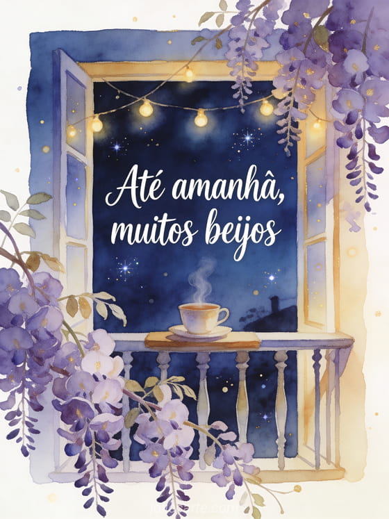 Compartilhe um desejo acolhedor de noite com caligrafia em aquarela, glicínia em cascata, uma pequena varanda, uma xícara fumegante, luzes de fada e tons azuis e dourados. Veja também um cartão de beijos da noite até amanhã, um cartão de beijos até amanhã gifs ou um cartão de até amanhã beijos imagens.